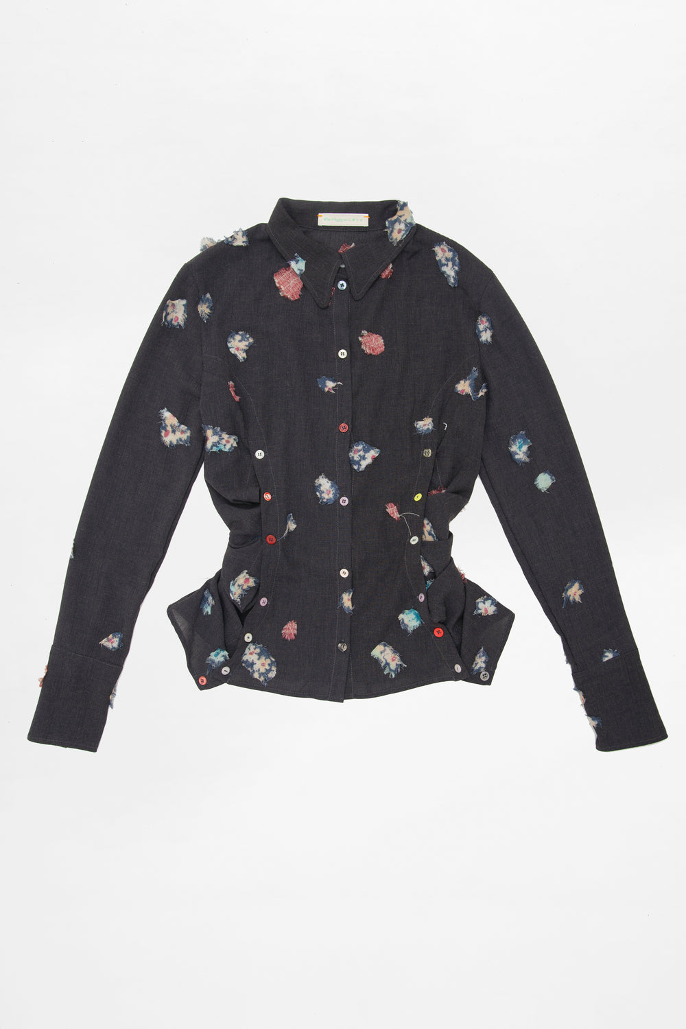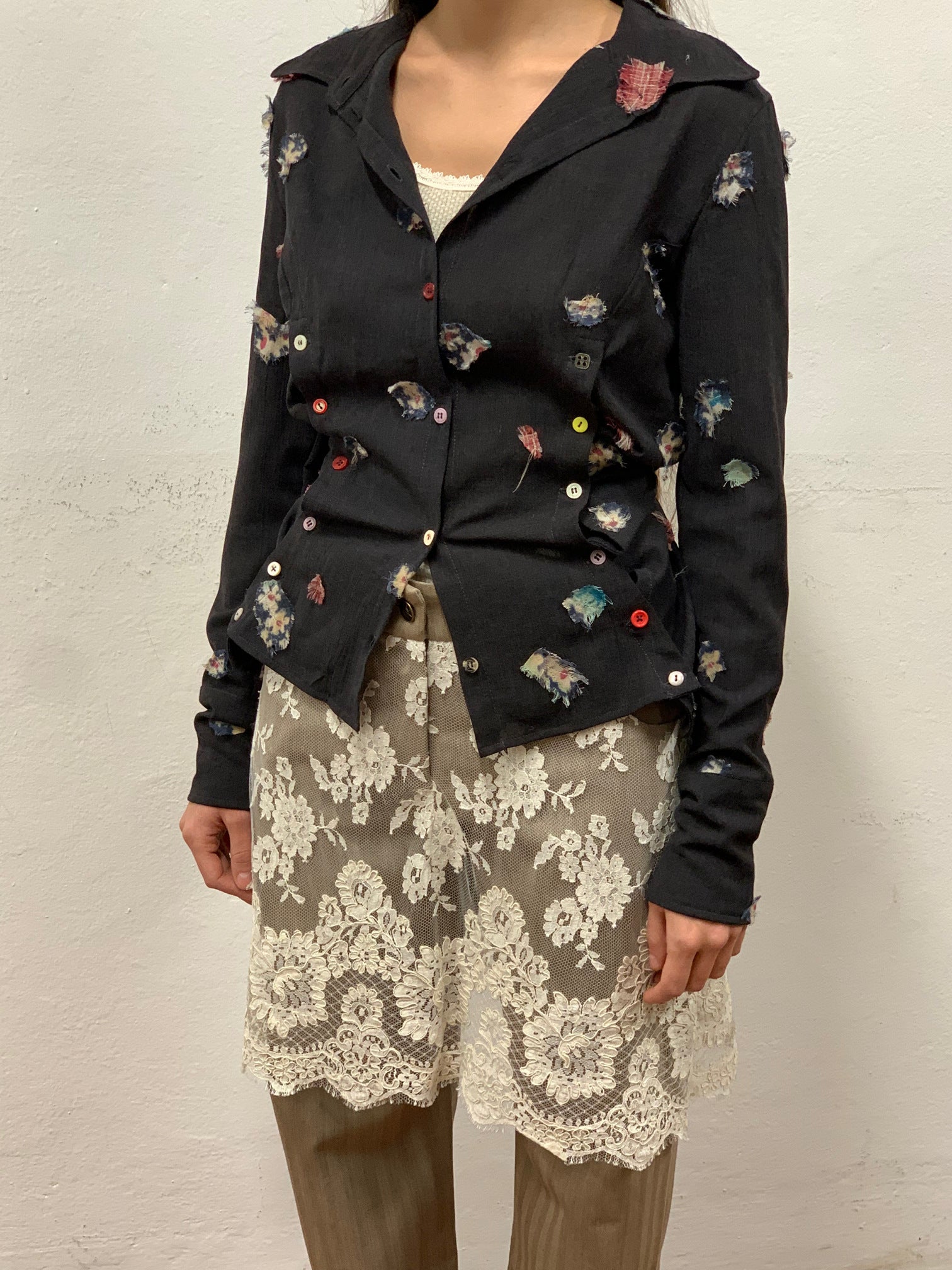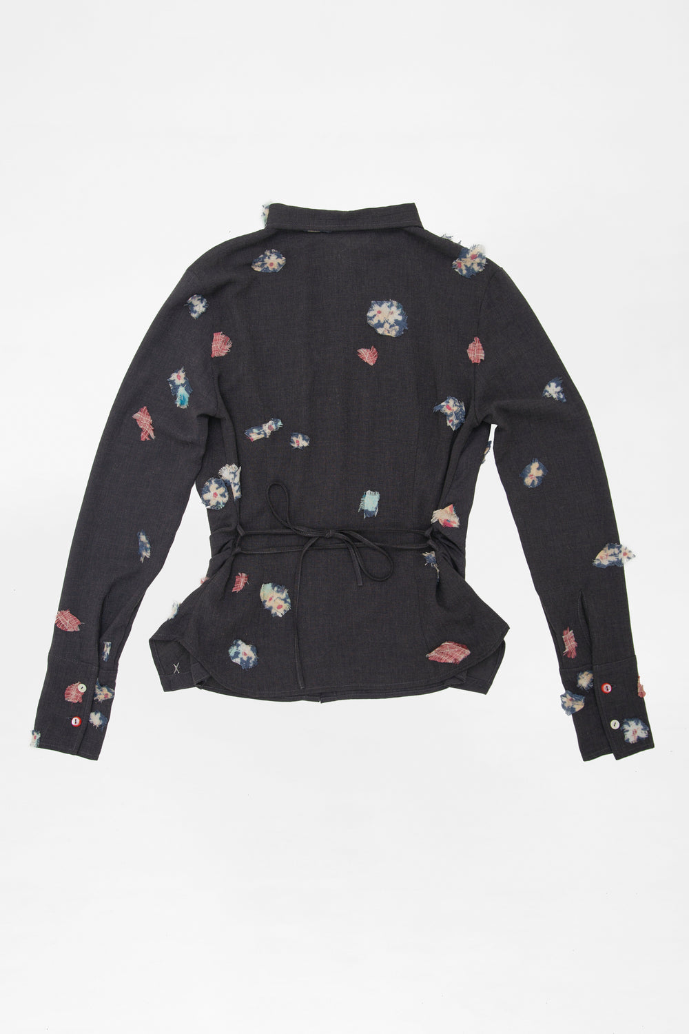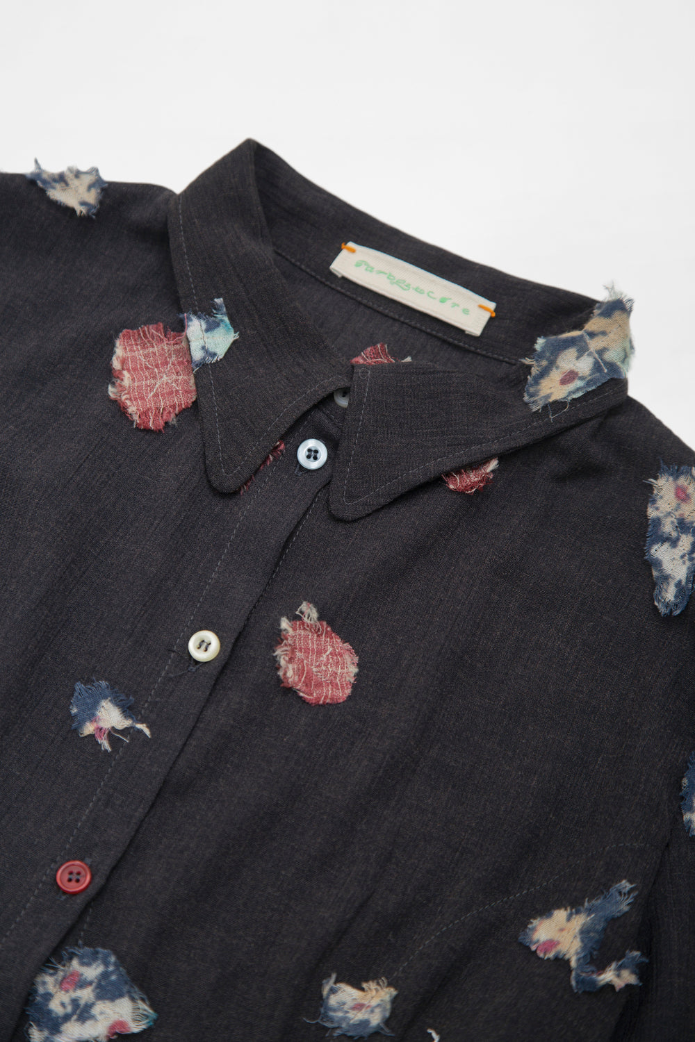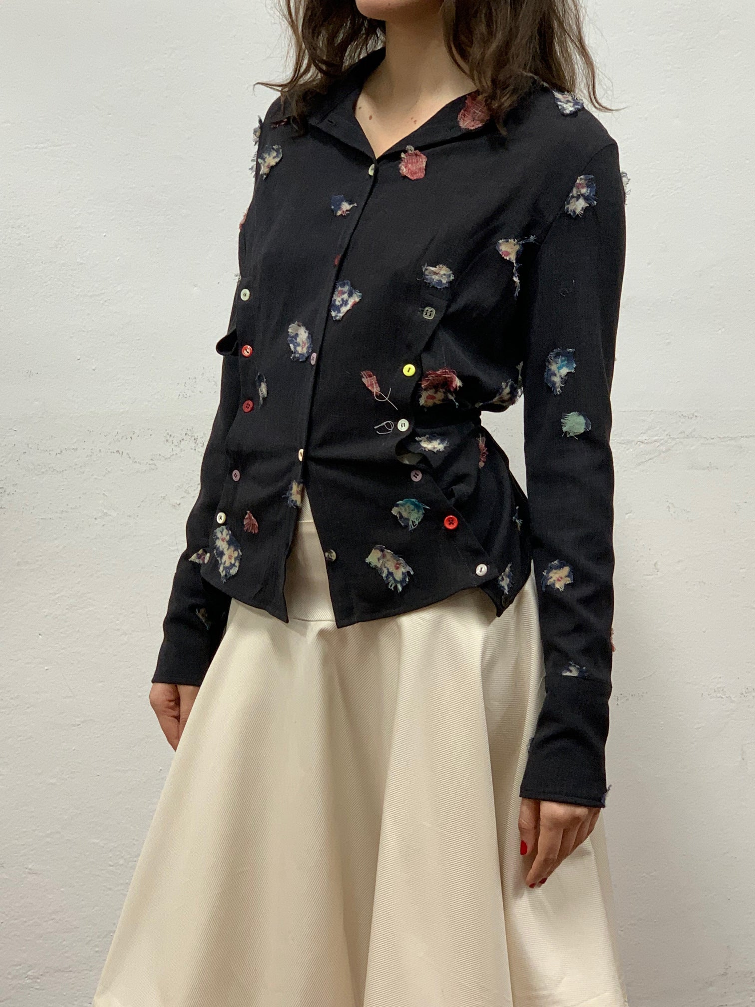 - Shirt with decorative raw cut patches. - Side opening with buttons and pleats. - Adjustable Waist.