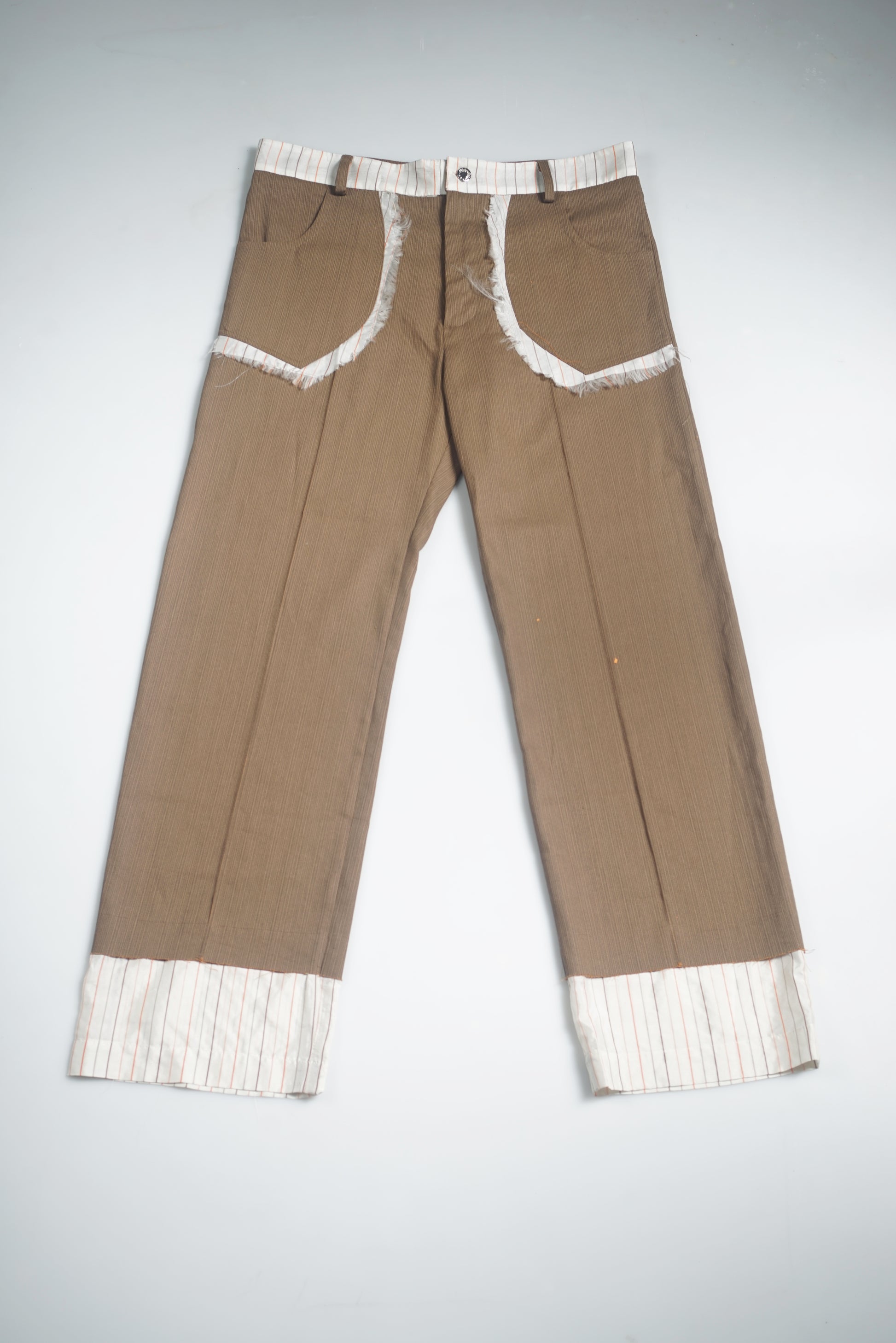 • Trousers with contrasting lining peeking out from pockets and pant hems.