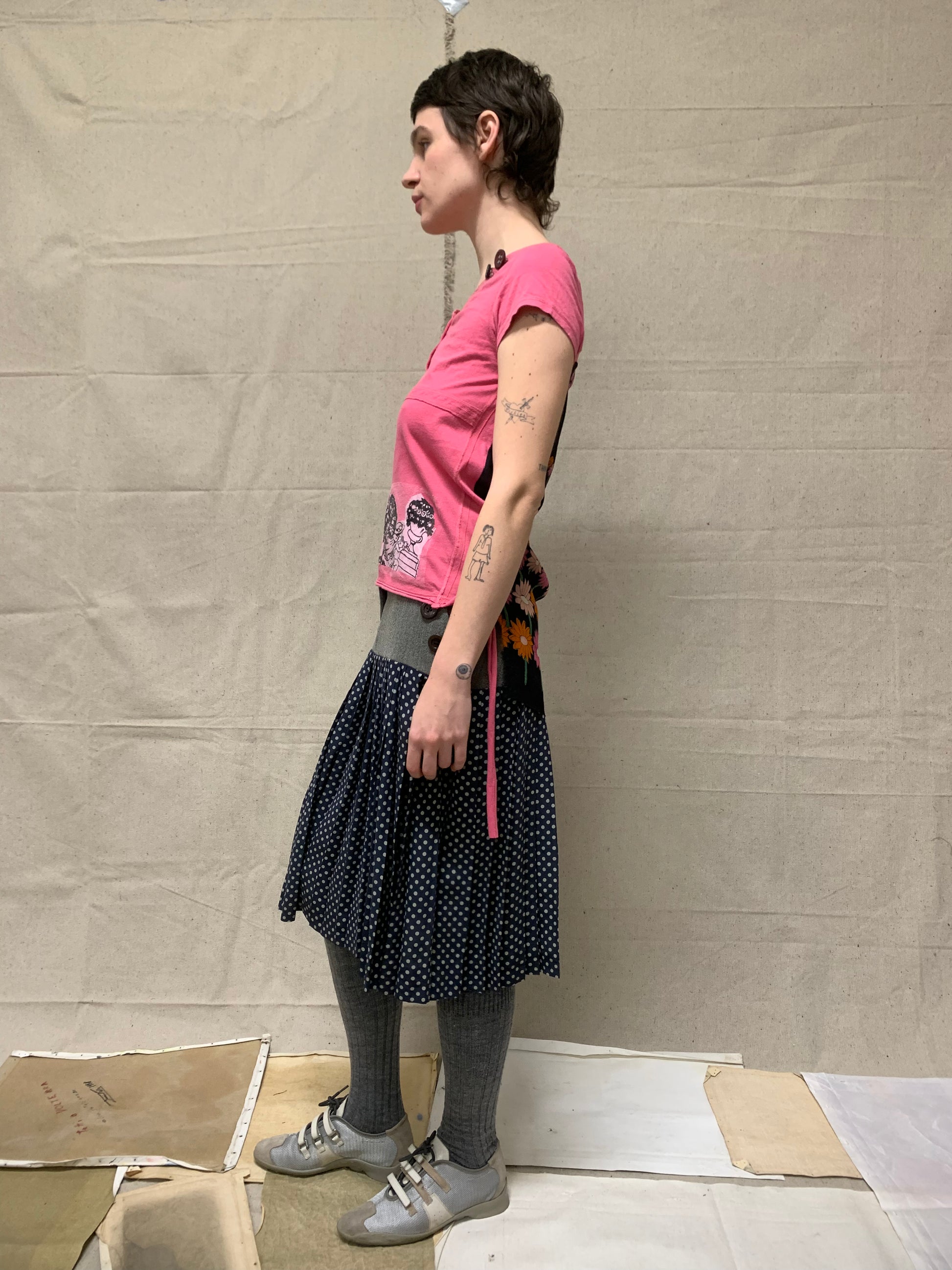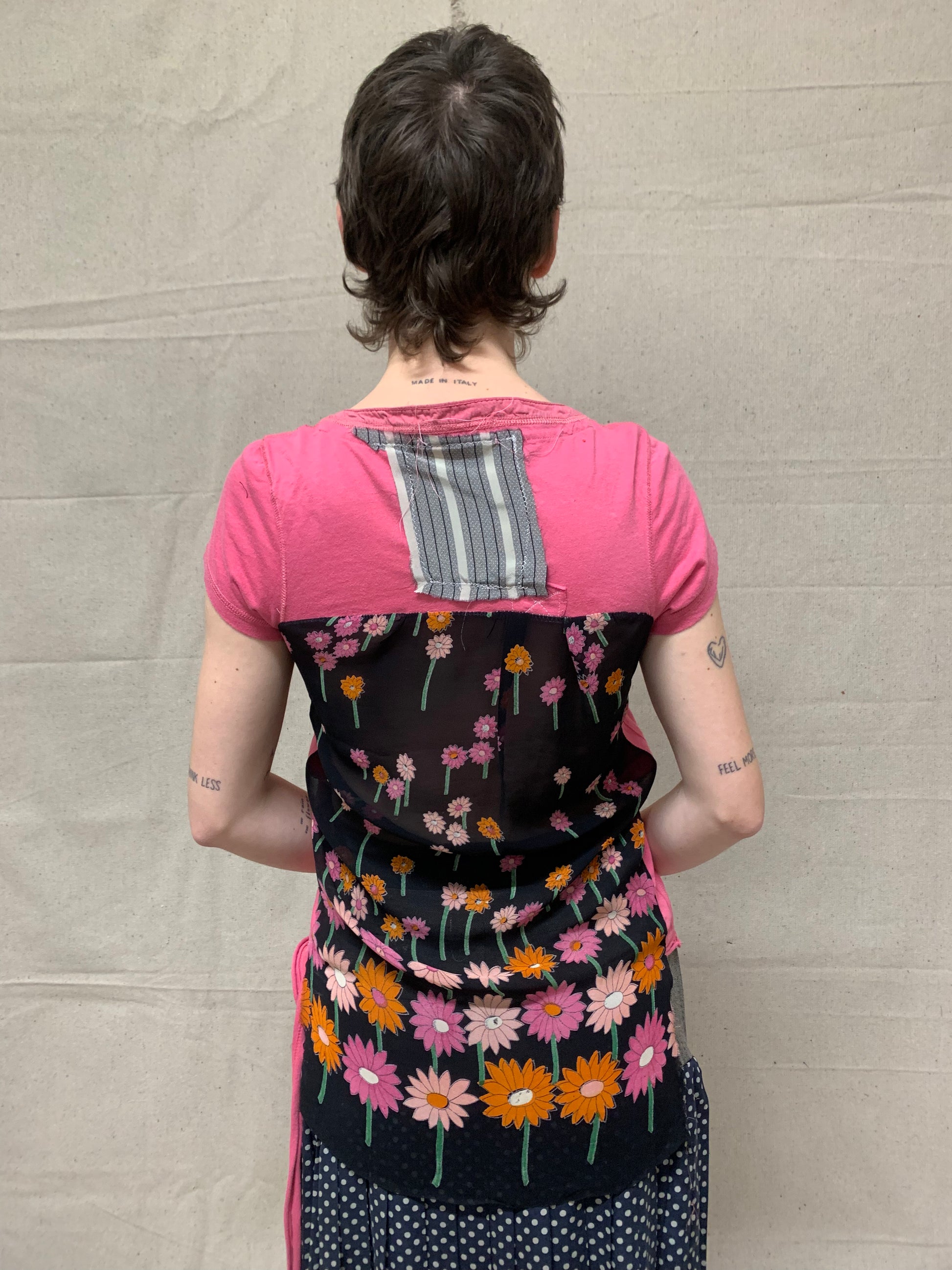 Deconstructed short-sleeve t-shirt with a long printed back panel; print design on the front.