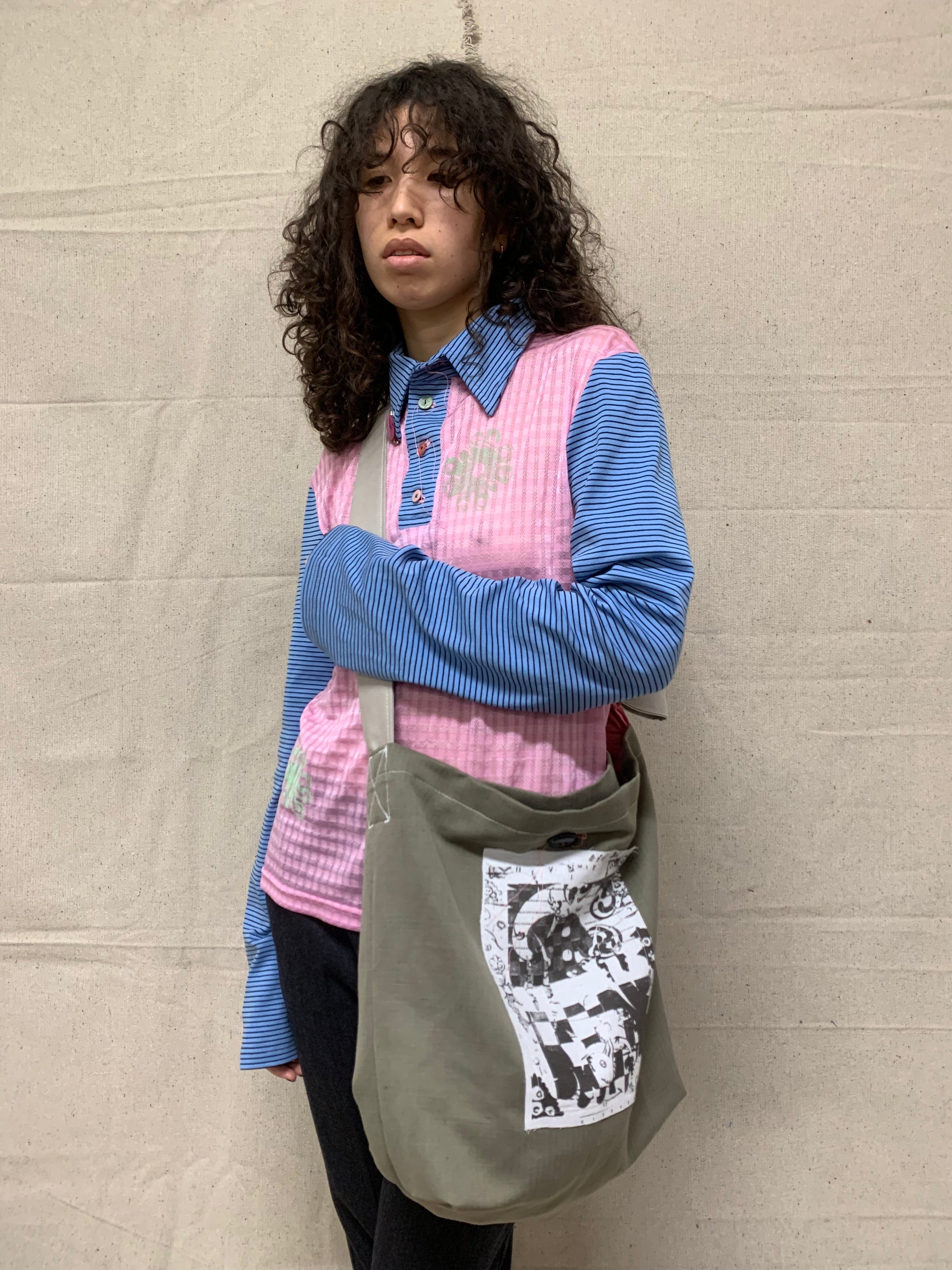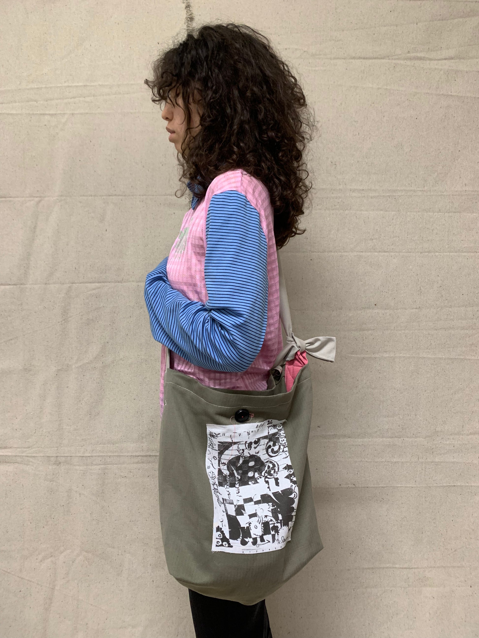 Crossbody bag with an adjustable knotted strap; button closure; printed patch on the front