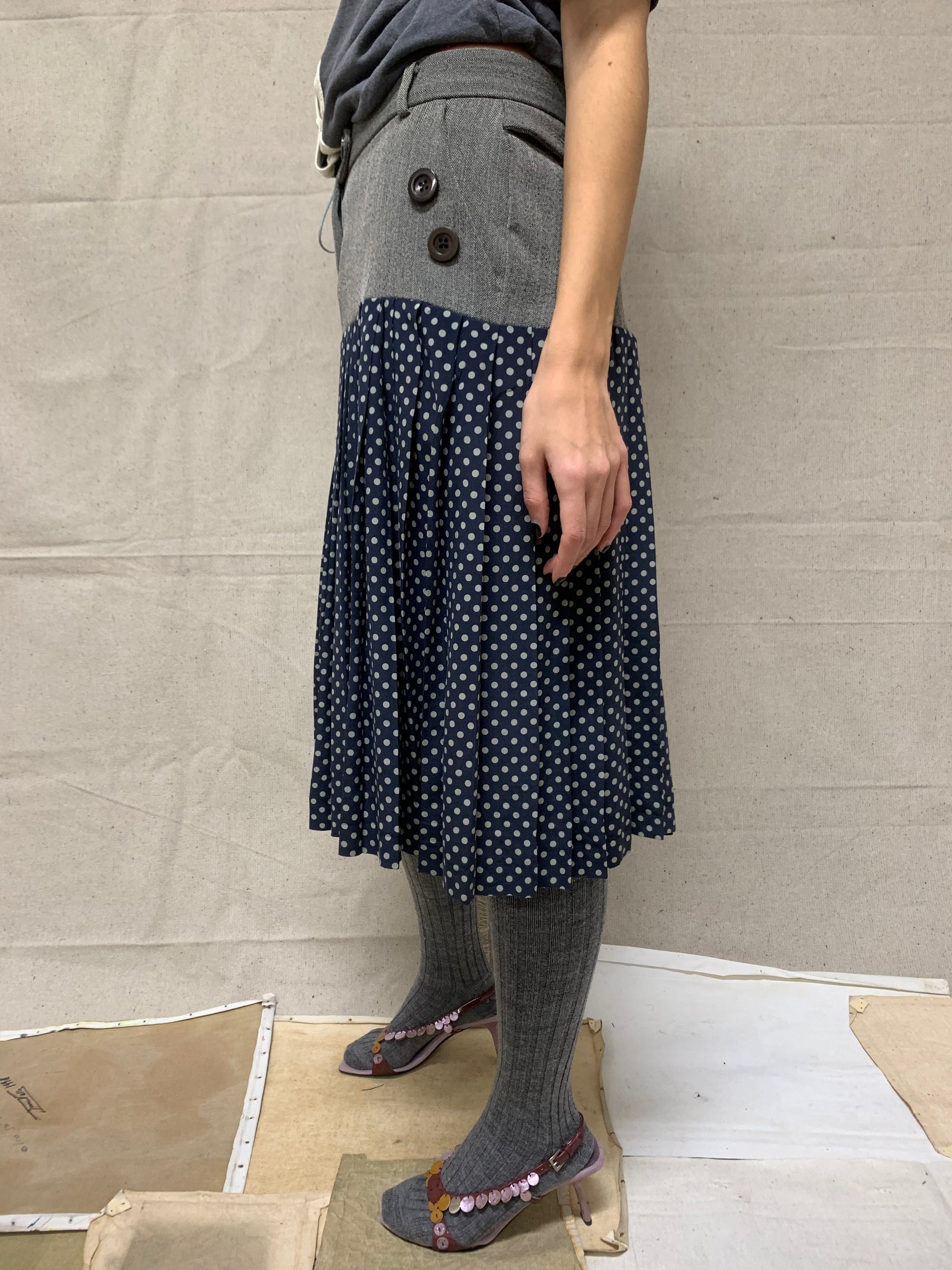 Pleated polka-dot skirt made with two different fabrics; front and back pockets; embellished buttons