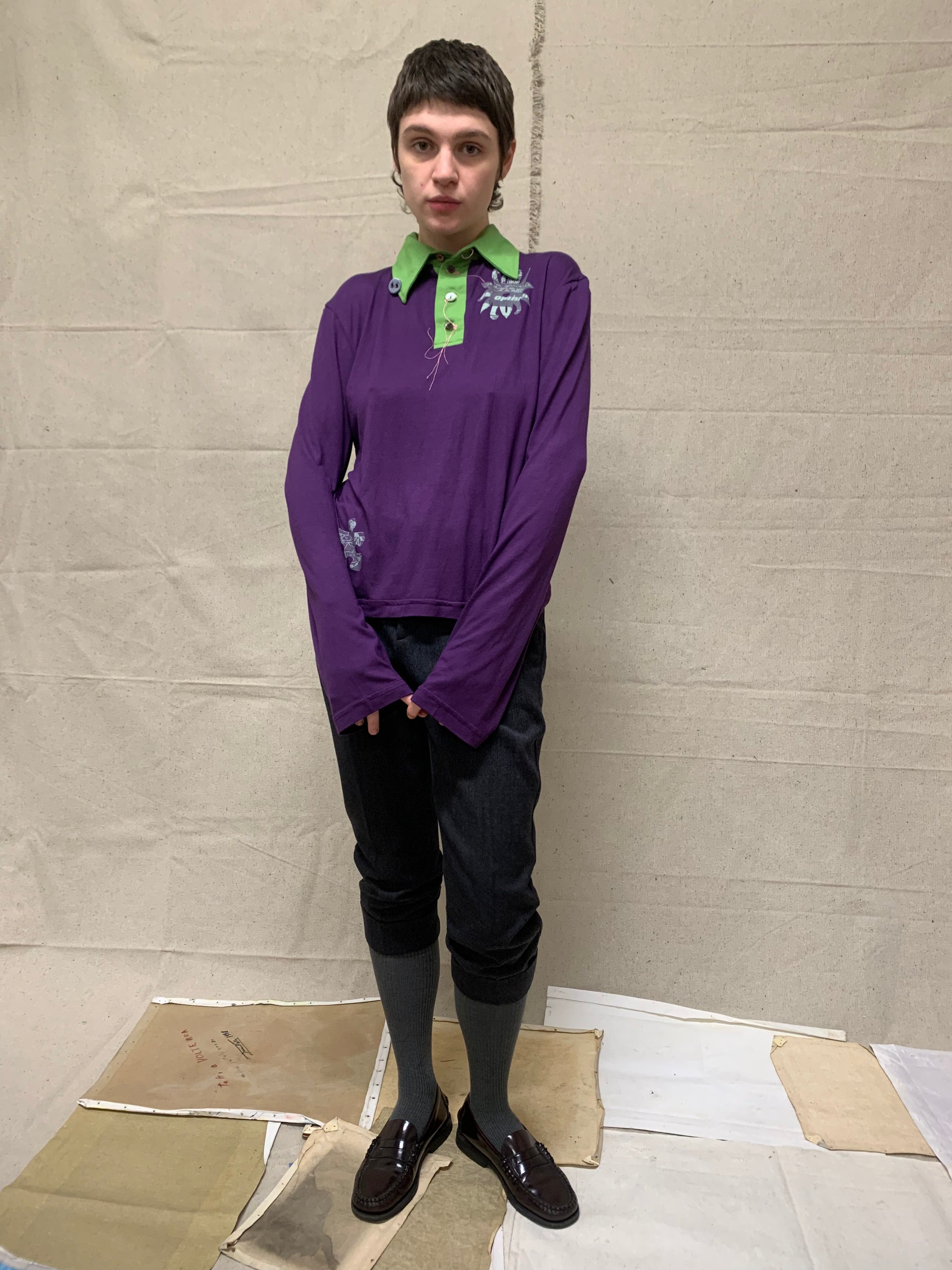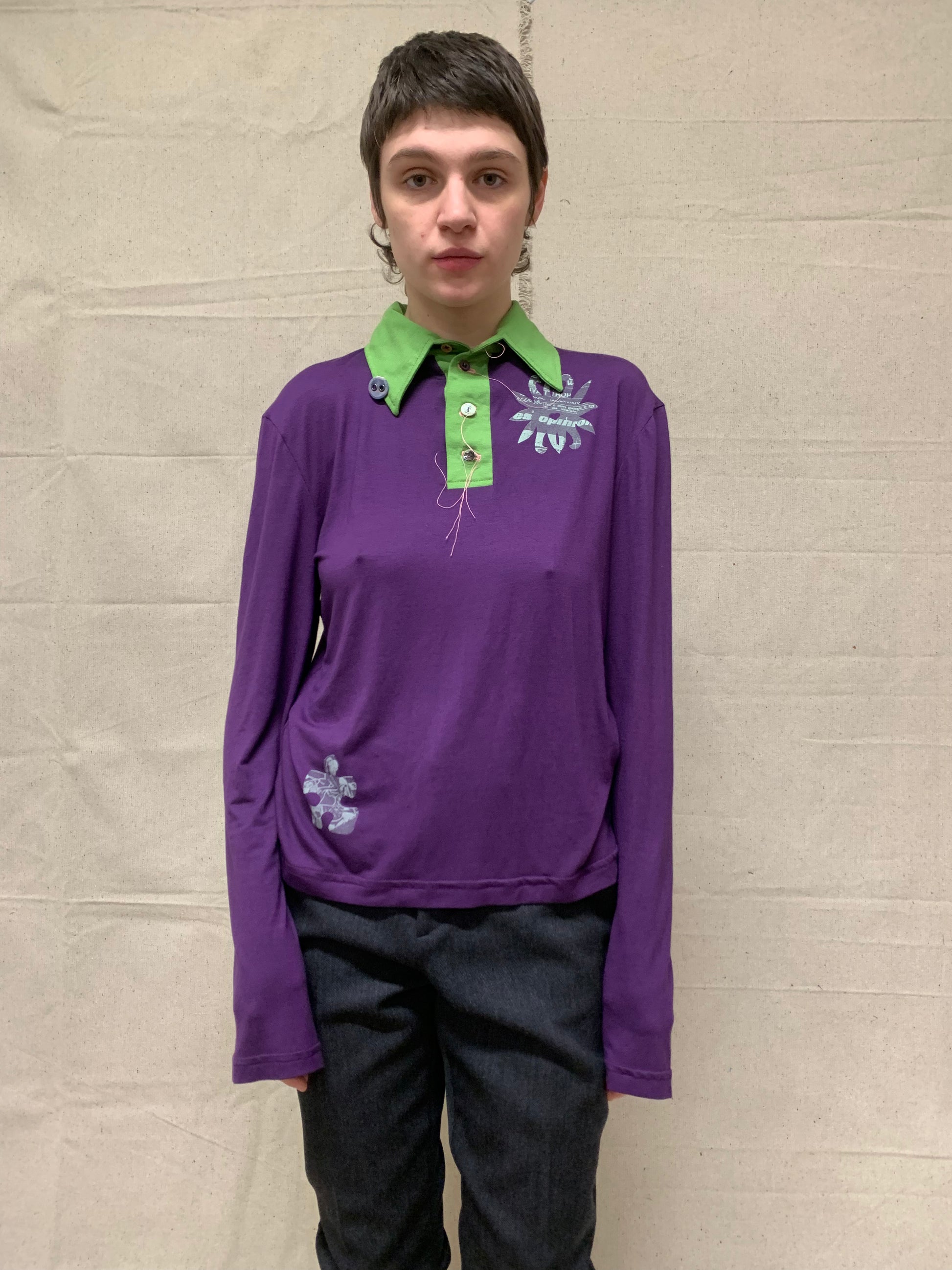 Polo made from fabrics in different colors; screen-printed; vintage mismatched buttons; relaxed fit; stretchy fabric; unisex