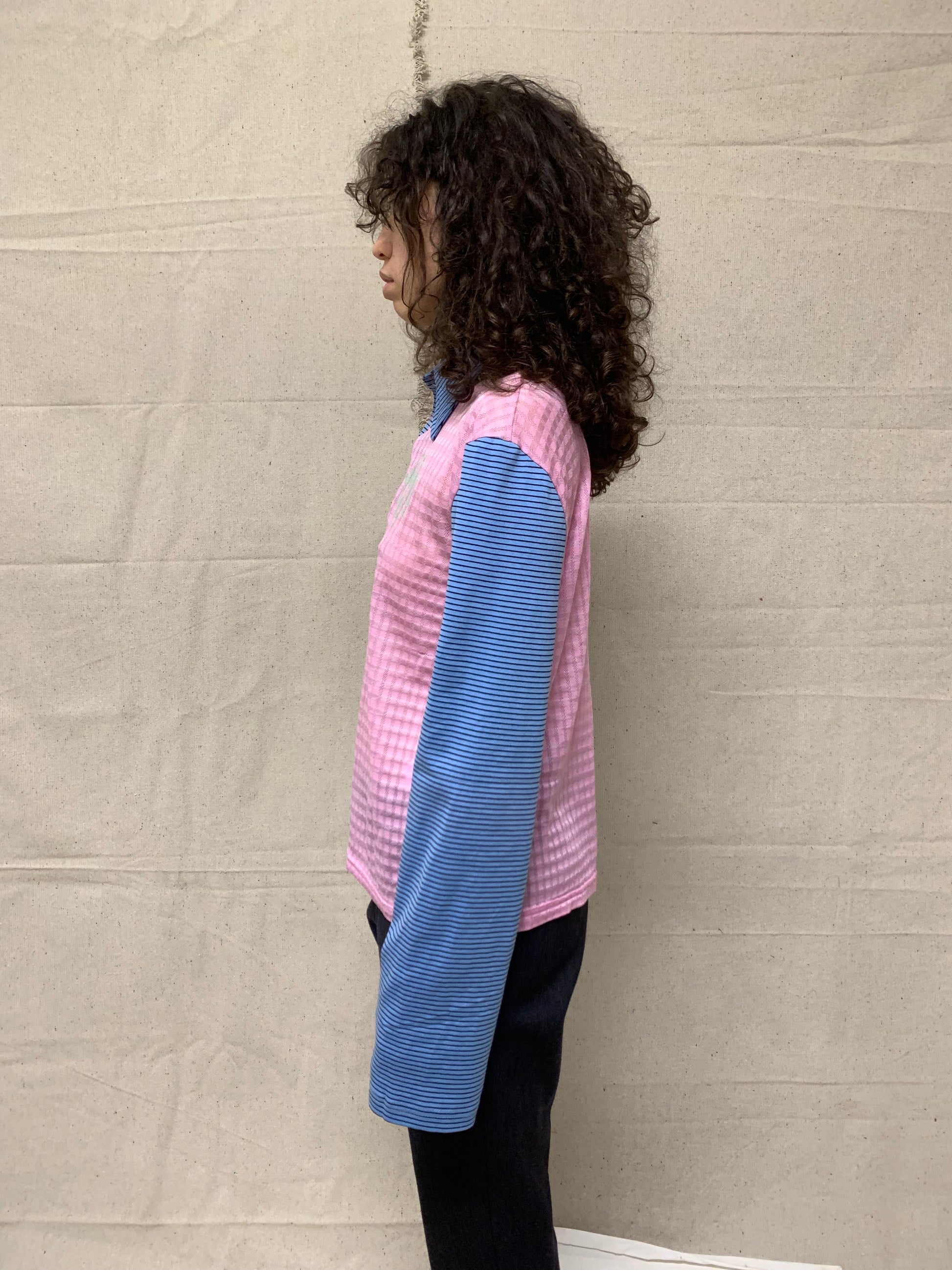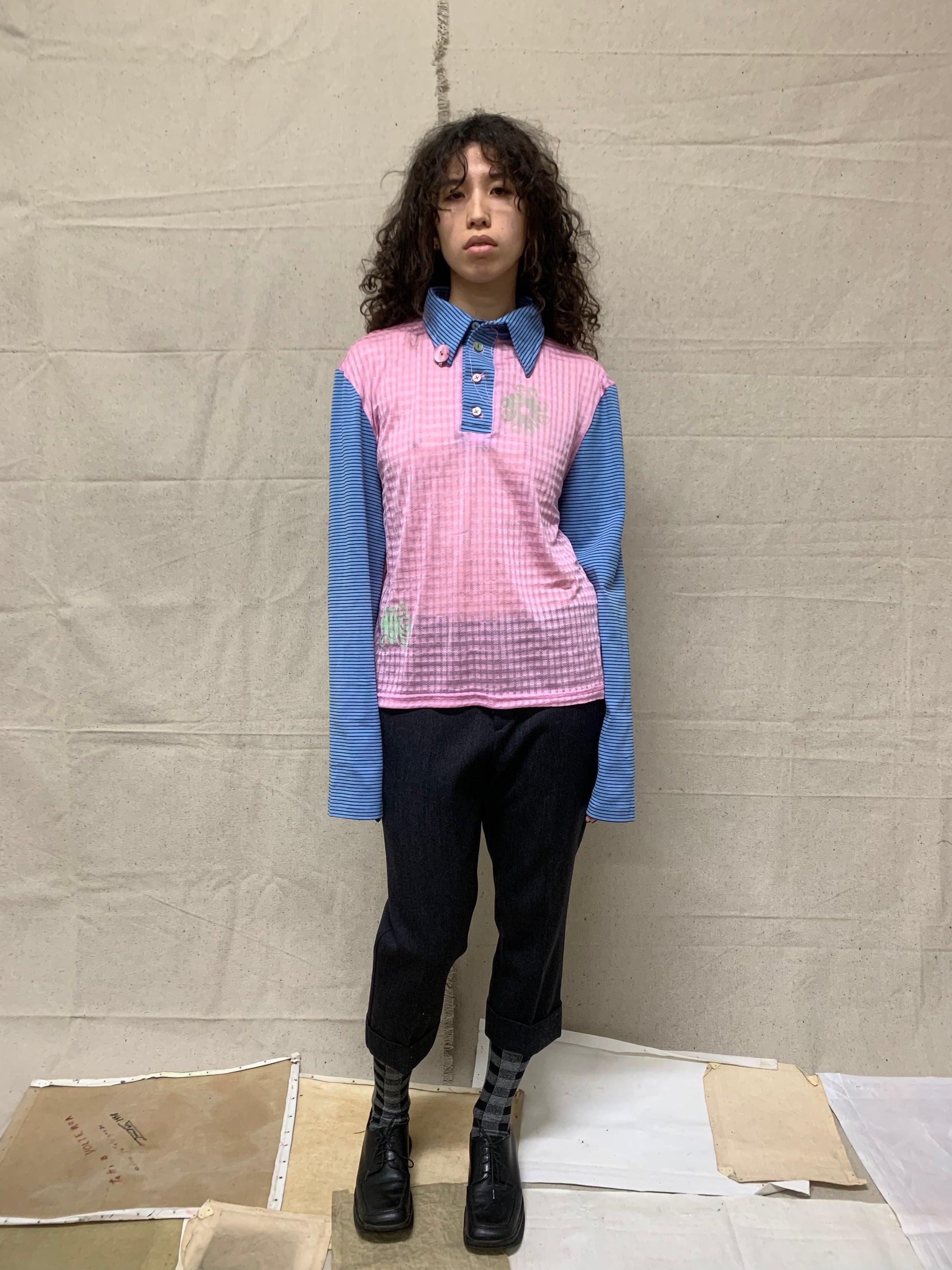 Polo made from fabrics in different colors; screen-printed; vintage mismatched buttons; relaxed fit; stretchy fabric; unisex